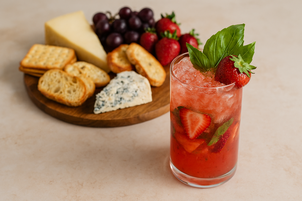 Pour into glass and top off the glass with club soda. Serve garnished with a fresh strawberry and basil leaf.4